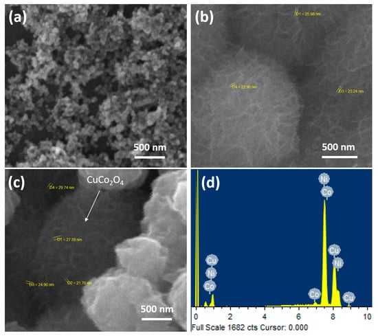The SEM images of the NiCo2O4, CuCo2O4, and CuCo2O4@NiCo2O4 are shown in Figure 3a–c. In Figure 3a, the NiCo2O4 exhibits a uniform morphology with nanoparticles spherical in shape. In Figure 3b, the CuCo2O4 seems to possess a dandelion flower-like morphology with nanosheets that are vertically aligned. In Figure 3c, the SEM images of the CuCo2O4@NiCo2O4 is shown, in which it is evident that these dandelion nanoflowers of CuCo2O4 are directly deposited on the nanosphere of NiCo2O4. These observations clearly show that under hydrothermal treatment these metal oxides self-assemble and interconnect with each other. The uniform distribution and even sizes of these nanoparticles on the nickel foam surface in dandelion flower-like morphology can be attributed to the hydrothermal method. These vertically aligned nanoarrays of the CuCo2O4@NiCo2O4 structure are of great potential use for ions diffusion in electrochemical reactions, evident in the greater electrochemical activity of the composite electrode. The energy dispersive spectroscopy (EDS) of CuCo2O4@NiCo2O4 (Figure 3c) was measured to observe the elemental distribution in the prepared material. The EDS spectrum in Figure 3d illustrates the presence of Ni, Cu, Co, and oxygen atoms in the prepared material.