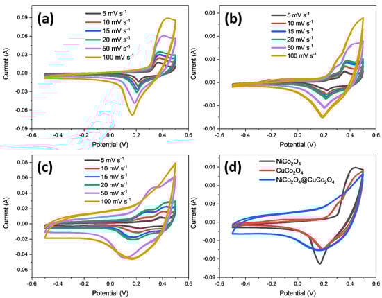 In Figure 4, the CV plots of the materials are displayed within a potential window of −0.5 to 0.5 V at multiple scan rates. It is widely understood that the area enclosed in the CV curves is representative of the capacitive potential of the material [28,29]. It is evident that the area enclosed by NiCo2O4@CuCo2O4 is larger than that of the single NiCo2O4 or CuCo2O4. Figure 4a demonstrates the CV plots of NiCo2O4 at various scan rates (i.e., 5, 10, 15, 20, 50, and 100 mV s−1). When the rate of scanning potential increases, the reduction and oxidation peaks are shifted to a negative and positive potential, respectively, with the surge in the peak current. The increase in the peak current has slightly affected the polarization and intrinsic resistance of the electrode because with the increases of the scan rate, the insertion and extraction of the charge carriers will be increased in the electrolyte and on the surfaces of the electrode [30]. A pair of redox peaks are noted on the CV curves of the NiCo2O4, which is due to the Ni2+/Ni+ and Co3+/Co4+ redox couple [31]. Similar oxidation and reduction peaks are noted for the CuCo2O4 and composite electrode. These redox peak pairs emerged due to the direct growth of active material on the Ni foam and thus contributed to an increase in the electrochemical activity with enhanced surface area. It is apparent from all of the CV plots that the shape of the curves did not change with the surge in the scan rate; only slight polarization was observed. In Figure 4b,c, the CV curves of CuCo2O4 and the NiCo2O4@CuCo2O4 composite are given, which show identical behaviors like NiCo2O4. In Figure 4d, the comparison of CV curves of the CuCo2O4, NiCo2O4, and CuCo2O4@NiCo2O4 are presented, in which it can be observed that the CV curves of the composite are enlarged in comparison to those of the single cobaltite. The CV plots of the hybrid electrodes encompass more area as compared to the other two electrodes, demonstrating that the composite electrode has a larger capacitance. Thus, a fast redox reaction is possible due to the greater specific surface area of the prepared composite electrode. All CV curves of the materials in Figure 4a–c are well shaped, demonstrating their potent capacitive behavior.