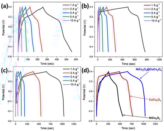 Galvanostatic charge discharge (GCD) curves at different current densities in the potential window of −0.5 to 0.4 V of (a) NiCo2O4, (b) CuCo2O4, (c) NiCo2O4@CuCo2O4. (d) Comparison of GCD curves of NiCo2O4, CuCo2O4, and CuCo2O4@NiCo2O4 at 1 A g−1.