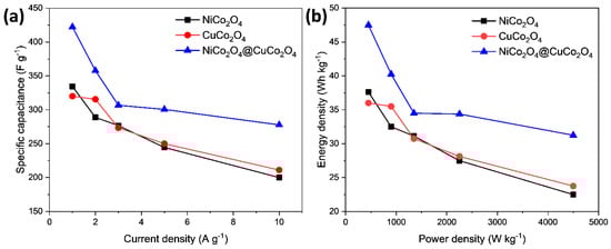 (a) Specific capacitance vs. current density and (b) Ragone plot of NiCo2O4, CuCo2O4, and CuCo2O4@NiCo2O4 electrodes.