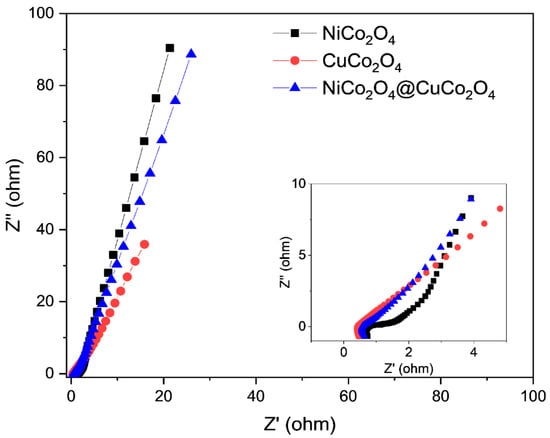 Electrochemical impedance spectroscopy (EIS) testing was done to assess the charge transfer resistance and ion diffusion of the prepared electrodes. The Nyquist plots of the NiCo2O4, CuCo2O4, and CuCo2O4@NiCo2O4 electrodes are displayed in Figure 7. Each Nyquist plot consists of a distorted semicircle and oblique line. The semicircle diameter represents the charge-transfer resistance because of the diffusion of the ions [39]. It is evident in Figure 7 that the slope line of all of the materials was less than 45°, while the diameter of the semicircle for CuCo2O4@NiCo2O4 is much smaller than the NiCo2O4 electrodes. The lower charge transfer resistance of CuCo2O4@NiCo2O4 resistance, as displayed in Figure 7, can be ascribed to the synthesis of the material on nickel foam with the enhanced reaction sites and diffusion rates. The inset of Figure 7 shows the Nyquist plot at a higher frequency region; the semicircle diameters of CuCo2O4@NiCo2O4 and CuCo2O4 are much smaller than that of NiCo2O4. The reduced resistance of the CuCo2O4@NiCo2O4 and CuCo2O4 is due to the better electrical conductivity of copper and increased surface area in the composite electrode.