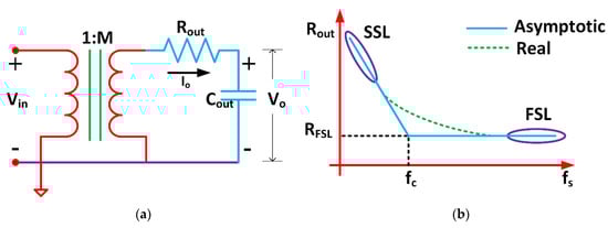 It was pointed out in [21] that the output resistance of SCPC (Rout) is a function of the switching frequency, as shown in Figure 1b, and it can be inferred that Rout behaves asymptotically different at low and high switching frequencies. Its value can be found from the square root of the sum of the squared asymptotic values. However, Ref. [20] proposed a simple yet systematic approach to model the Rout in the case of a two-phase SCPC. This method depends on SSL and FSL operating regions that correspond to asymptotically different characteristics, as pointed out in [19]. Based on this model, the approximated value of Rout can be found from the following: