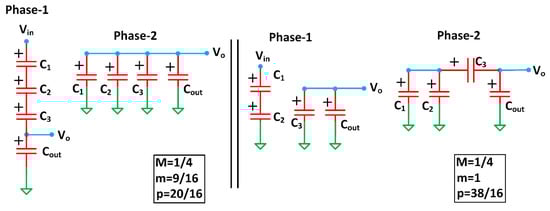 where m and p are the positive integers. For the same voltage conversion ratio M, m and p behavior changes w.r.t the topology. For example, two circuit topologies with M = 0.25 exhibit different output impedances, as shown in Figure 2.
