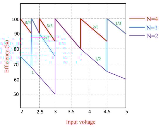 Comparison of a multiratio switched-capacitor converter’s theoretical efficiency (without including switching losses), with N = 2, 3, 4. ‘N’ represents the number of capacitors together with the output capacitor Cout [25]. Reproduced from [25], IEEE TRANSACTIONS ON POWER ELECTRONICS:2013.