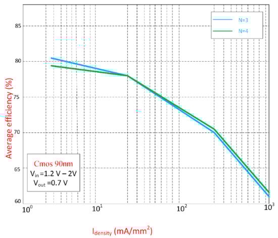 Efficiency comparison of two different MR-SCPCs, with N = 3 and N = 4, as a function of the current density by considering switching losses [28]. Reproduced from [28], In Proceedings of the IEEE International Solid-State Circuit Conference: 2012.