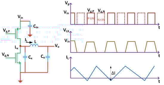 Inductive-switching power converters are highly suitable for off-chip applications, as they provide high power density, efficiency, and regulation. Inductive converters are commonly used for integration due to the ease of understanding of the fundamental operations of the circuit, control techniques, and availability of abundant number of topologies, and their capability for high power density and efficiency can be extended to ICs, even though challenges are experienced. The block diagram of the power stage of the synchronous inductive buck converter and corresponding steady-state waveforms are shown in Figure 5. Its derived topologies are well matched for fully monolithic integration. The important criterion is to check and neutralize the different power losses that restricts the 100% high efficiency for a switching power converter circuit.
