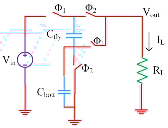 As the circuit phase changes, the energy is wasted in charging and discharging the capacitances at the ends of floating capacitors of the SCPC, and this waste contributes to these switching losses. These losses are mainly due to the common planar nature of integrated capacitors, and are mainly associated with the top and bottom plates of parasitic capacitances, as well as the junction capacitance between the drain-source terminals of switches. Bottom-plate losses contribute in large extent to switching losses, even though they greatly depend on technology. For the same voltage conversion ratio M, different topologies produce bottom-plate losses in different amounts; this is addressed in [22,23]. Moreover, Ref. [22] developed a switching scheme to decrease the amount of these losses.