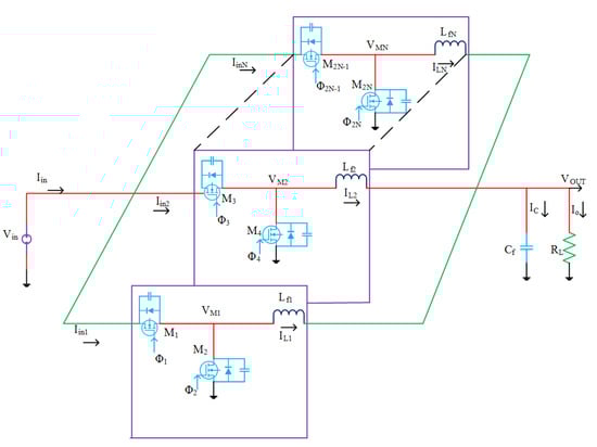 A single SCPC is divided into numerous smaller SCPCs in a modular approach, which leads to a multiphase SCPC (MP-SCPC) [26,28,29,35,36,40,41], and their clock phases are uniformly shared throughout the entire switching period. The output voltage ripple will be reduced because at different time constants, the charge is applied to the output with the help of small charge packages. By doing so, the input current shows a smaller ripple when the charge is taken in small packages from the input source voltage. As a consequence, the noise generated is of a lower value. The size of Cout gets reduced at the output node when the charge is injected at one or fewer phases, and this further remarkably reduces the size of the integrated SCPC.