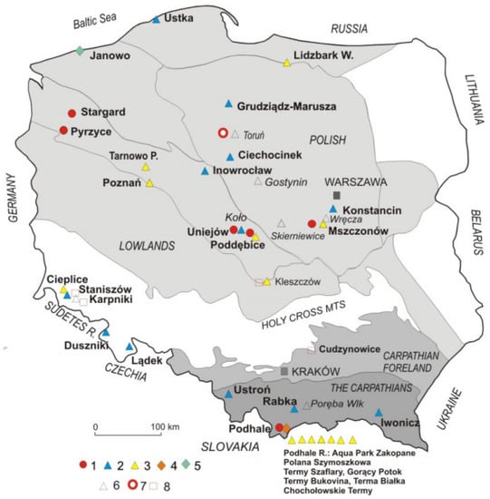 Geothermal waters in Poland are most often used for recreational, heating and health purposes. Geothermal waters are used in heating plants in Stargard, Pyrzyce, Uniejów, Mszczonów, Poddębice and in Podhale [87]. Often, boreholes in Poland, as well as in other countries, are located in poorly urbanized areas. The distribution of geothermal installations in Poland is shown in Figure 1.