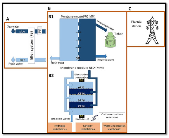 The impacts of this technology are similar in the construction phase to those of seawater desalination plants, wastewater treatment plants, or other renewable energy plants. Since there is currently insufficient on-site experience on the impacts, the stressors considered were based on the analysis of the components of the PRO and RED technologies (Figure 2). This figure gives a general view of the main components of both technologies. In section A, the pipes and the filtering system are shown. In section B, depending on the technology used, and the expected production, the site will require several, repeated PRO or RED modules (membranes in both cases, in RED also electrolyte solutions), as well as hydraulic installations (turbines in PRO), sanitary installations and storage facilities for inputs and waste. Section C shows the electrical installations for power distribution/storage (should include cabling, towers, etc.). In both PRO and RED, a final by-product is a brackish water or seawater, depending on the scheme used (SW/FW, SW/HW, or FW/HW).