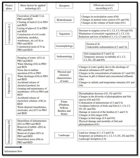 A general analysis of the environmental impacts of PRO and RED technologies in three phases (construction, operation, and decommissioning) is presented. These impacts can also be applied to other potential systems that use salinity gradients for energy production (river mouths, estuaries, coastal lagoons). The receptors highlight those characteristics of coastal environments that may be susceptible to change due to the SGE (Figure 3). The responses were analysed for each receptor, revealing the potential impacts of this technology (Figure 3).
