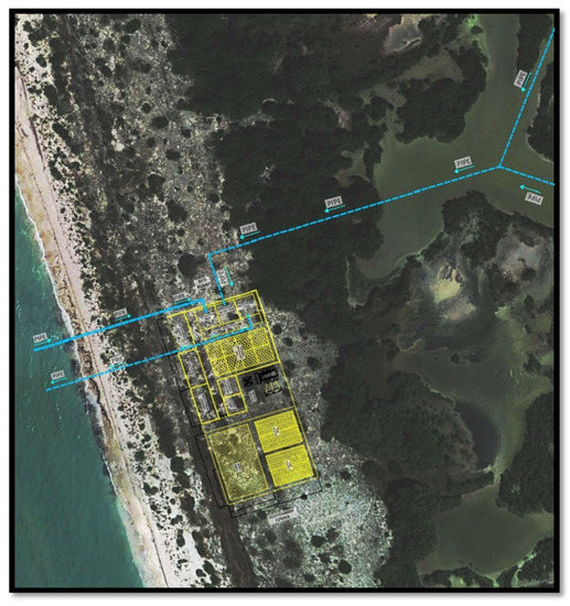 The stressors examined (Figure 3) include excavation, site preparation, placing pipelines, and the construction of platforms and modules. The impacts are similar to those of any other engineering project: removal of vegetation, habitat loss, erosion, unwanted sedimentation, soil compaction, temporary increase in turbidity, avoidance behaviour of birds and fish (due to construction noise), damage or removal of benthos, change of land use, temporary air pollution, and landscape disruption. Nevertheless, all of these will depend on the construction techniques and on the precautionary measures taken. The plant would be located on the seashore (Figure 2, section B), and as it would be affected by the tides, it is proposed that the RED plant be built on pillar-supported infrastructure (palafitte) that will allow water to flow beneath. These low-impact structures do not require extensive excavation [51] and would minimise some impacts on geomorphology and vegetation. They would also permit the free passage of wildlife, particularly useful in storm surge events. In terms of landscape disruption and land use change, as it is a small project, the impacts are expected to be minimal. Given that the site proposed for the plant will not modify the hydrodynamics of the lagoon, natural sediment transport changes are not expected. Additionally, any increase in turbidity, damage or elimination of benthos, erosion or soil compaction, and air pollution will only be temporary. In the case of vegetation and habitat loss, this location was chosen (Figure 4) precisely because there are no large patches of vegetation, except for some coastal dune species in the vicinity (Table 1).