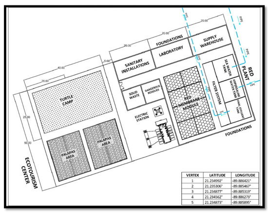 The proposed location for the RED plant is on the coastline between La Carbonera lagoon and the coastal dune, outside the main SRZ1 polygon, and under the jurisdiction of the Federal Maritime Terrestrial Zone (ZOFEMAT) (A, Figure 1 and Figure 4). At this location, several elements need to be constructed (roads and other infrastructure related to basic services). In the literature, as an example, the design of a PRO plant with a production capacity of 50 kW net output covers approximately 7000 m2 (the approximate size of a football field) [49], while the area of the Afsluitdijk RED plant covers approximately 2750 m2 (measured from Google maps). The total area proposed at La Carbonera is 5250 m2, the RED plant elements will be distributed in 3000 m2 (Figure 4 and Figure 5), which includes three tanks for the concentrated (hypersaline), diluted water (marine or fresh), and the resulting effluent (brackish marine). There will also be space for the membrane modules and for a test laboratory. Finally, spaces for storage, waste storage, sanitary facilities, and an electrical station will be added (Figure 5).