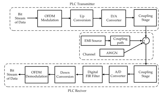 Demodulation of the received signal starts with passing the carrier signal through a coupling circuit to extract the PLC signal from the main grid power (220 V–50 Hz). After that, the analog signal is converted into a digital signal using an analog-to-digital (A/D) converter. Furthermore, a digital finite impulsive response (FIR) filter is used, followed by a digital down converter to extract the digital data from the carrier signal. Consequently, the data are demodulated and demapped to return to its digital binary form.