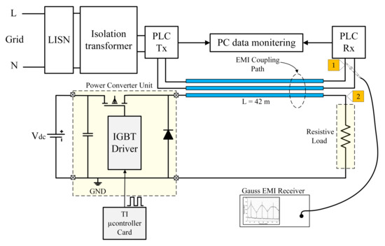 The proposed hardware setup is inspired by the EMI between power electronics converter and a smart meter utilizing the G3-PLC. Such a case is typical in the microgrid environment, where renewable energy sources are installed in the same place as the smart meter. The EMI may flow between both circuits due to the mutual coupling between circuit cables. The communication circuit consists of two G3-PLC modems representing the point-to-point communication between a specific transmitter and receiver. The circuit works using two Microchip ATPL360 PLC modems as shown in Figure 3, with both modems being configured to work based on CENELEC-A standard frequency range and the G3-PLC mode. In addition, the line stabilization impedance network (LISN) and isolation transformer are connected between the PLC circuit and the grid to isolate the outside EMI noise and make sure of the robustness of the results.