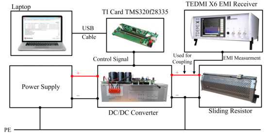 The EMI source is represented in the power connection between a DC/DC converter and the load. The load is connected to the converter using a cable of 42 m length, and the positive line of the load is situated directly beside the PLC cables with the length as shown in Figure 3. The cable in the tests is a typical YDYp AKS 3 × 1.5 mm cable used in domestic installations. This connection is similar to the link in [14] and will cause the existence of coupling between both circuits. The DC/DC converter was controlled using a Texas Instrument TMS320F28335 digital signal processing card and was connected to a variable DC supply changing from 100 V to 200 V. Table 2 shows the electrical data for the converter used in the setup. The DC/DC step-down converter topology was selected as an interference source due to its simple waveform of generated interference, which might be easily investigated. In the same context, the RanM driving signal parameters play an important role in the shape of the generated EMI. The spreading factor of the used RanM is set at 0.4, which means that based on Equation (1), the frequency will vary around the main switching frequency between 0.8 kHz to 1.2 kHz. Figure 4 shows the connection diagram of the proposed DC power circuit. In our implementation of the test in the laboratory, we used a sliding resistor as the load. For both communication and power circuits, we used copper cables of diameter 1.5 mm .