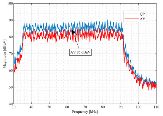 The Gauss Instruments TDMI X6 digital EMI test receiver was used to register the measurements. All the measurements were taken based on CISPR A standard in the range from 9 kHz to 150 kHz, using the Average (AV) and quasi-peak (QP) detectors with 200 Hz intermediate frequency bandwidth (IF BW).