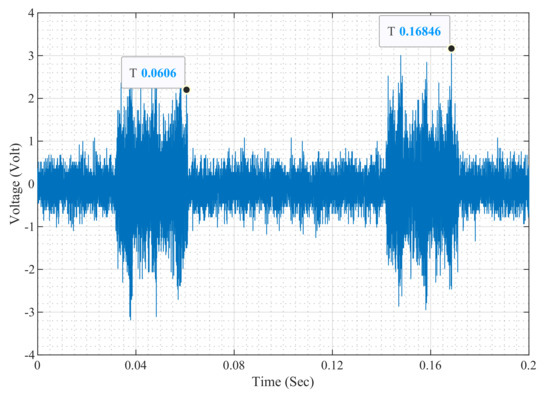 Table 3 shows the PLC communication parameter assumptions. The test was implemented using 3000 packets that were sent consequently. The time between packets was 100 ms, the modulation scheme used was the differential phase shift keying (DPSK) with all three types (DBPSK, DQPSK, and D8PSK). As the G3-PLC uses the CENELEC-A standard, the frequency range of the PLC OFDM signal is in the frequency range between 35 and 91 kHz, as shown in the QP and AV detectors frequency spectrum in Figure 5 (measured from point 1 in Figure 3). The level of the PLC spectrum reaches 85 dBuV for the AV detector at the intermediate frequency (63 kHz) of the PLC signal. The streaming of the PLC data in the time domain appears in the PLC voltage after the bandpass filter in the receiver as shown in Figure 6.