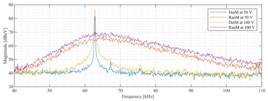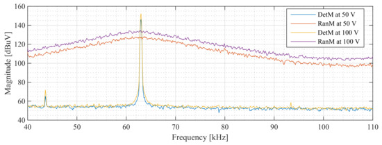 The converters were programmed to work using a switching frequency of 63 kHz, equal to the intermediate frequency of the PLC OFDM signal. The selected frequency is within the typical operating frequency range of medium power converters. Figure 7 shows the voltage spectrum measured directly from the load terminals in the case of DetM and RanM at 50 V and 100 V DC output voltages using the AV detector (measured from point 2 in Figure 3). As shown in the figure, the difference between the output voltage spectrum in the DetM and RanM at the fundamental frequency reaches almost 17 dB. The impact of the DC/DC converter output has its effect on the PLC circuit through the proposed coupling circuit as shown in Figure 8. The figure shows the frequency spectrum of DetM and RanM in the case of an output voltage of 50 V and 100 V measured from the PLC side (from point 1 in Figure 3) using an AV detector. The maximum magnitude of the spectrum (at the main switching frequency of the converter 63 kHz) reaches 81.6 dBuV for DetM and 63 dBuV for RanM at 50 V output voltage, and it reaches 87.5 dBuV and 69 dBuV in case of 100 V. It was noticed that the difference between both output voltages is 6 dB in both cases of modulations at the main converter switching frequency. The difference between RanM and DetM also reaches 18.8 dB at the same point. The achieved disturbance levels in the network are close to the limit levels, according to CISPR 11.