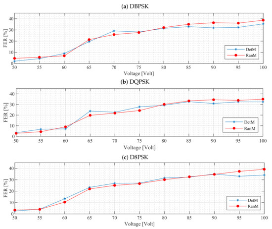 Figure 9 shows the percentage of data transmission error with the increase in the DC/DC converter output voltage ranging from 50 V to 100 V for the converter circuit in the case of DetM and RanM, along with the change in the PLC modulation. The ratio between the corrupted frames data to the sent data is calculated for every case to be the frame error rate (FER) and is represented as a percentage and can be formulated as