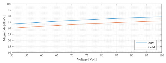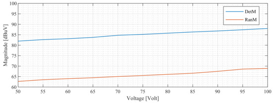 Figure 10 shows the relation between the frequency spectrum peak (measured from point 1 in Figure 3). In both modulation cases, the increase in the magnitude of the noise is followed by an increase in the percentage of FER, respectively. However, the FER is almost the same, despite an 18 dB difference in the spectrum peak value. Figure 11 shows the relation between the output voltage from the converter and the frequency spectrum magnitude in dBuV (measured from point 1 in Figure 3). In both DetM and RanM, the EMI receiver IFBW is set to 200 Hz following CISPR A standard, and the relation is linear in both cases. However, the difference between the frequency spectrum magnitude reaches almost 18 dB between the DetM and RanM. Figure 12 shows the same result as in Figure 11, but with different IFBW configurations in the EMI receiver set at 9 kHz, the difference between the DetM and RanM is on average of 3.5 dBuV at all voltage points, which confirms the symmetry of both techniques. Consequently, a difference appears between both techniques resulting from the methodology of the EMI spectrum measurement.
