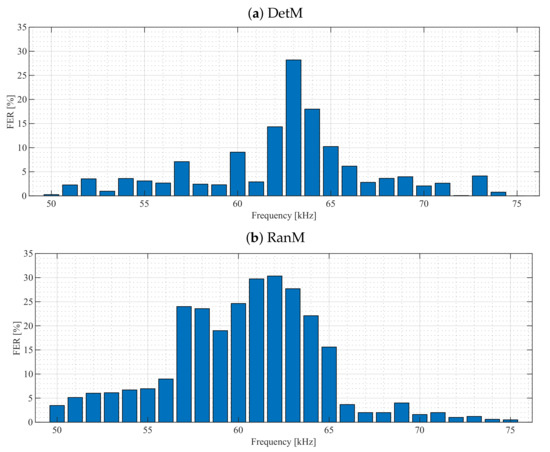 In contrast, on the other frequencies near to the intermediate frequency, the RanM causes more problems to the PLC systems than in the DetM. The randomized signal increases the percentage of FER in the case of other frequencies due to the fast jumping between the frequencies around the main switching frequency (central frequency ). On the other hand, the DetM affects only specific points in the PLC bandwidth, which could be a sensitive point in the communication system as in the case of choosing a switching frequency equal to the intermediate frequency of the G3-PLC system.