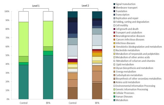 Gene expression classification of control and BPA samples based on KEGG Orthologs in MG-RAST. Samples were annotated at Level 1 in five categories (metabolism, human diseases, cellular processes, genetic information processing, and environmental information processing) and the sub-functions that correspond to the Level-1 categories are shown at Level 2 (default settings were assumed: alignment length: 15 bp, e-value: e-5, percent identity: 60%, minimum abundance: 3).