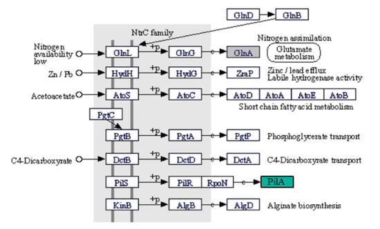 Two-component system pathway fragment from KEGG mapper, showing the expression of type IV pilus assembly protein (PilA) in the BPA sample (green) and glutamine synthetase (GlnA) in the control sample (grey).