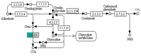 Purine metabolism pathway fragment from KEGG mapper, showing the active expression of urease in the BPA sample (green) and the control sample (grey).