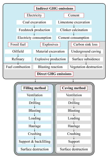 Underground caving leads to large-scale surface subsidence [19], and eliminates the carbon sink of vegetation on the ground surface. Although no surface subsidence or associated carbon sink loss occurs in filling-based projects, they require much more cement than caving-based methods, i.e., to backfill the underground void after excavation [20,21]. The GHG emissions of cement do not directly occur in the metal mining area, but both limestone extraction and clinker production generate GHG emissions [22,23]. Additionally, to ensure the consistency of the model, indirect GHG emissions from other sources (e.g., fossil fuels and industrial explosives) should also be involved.