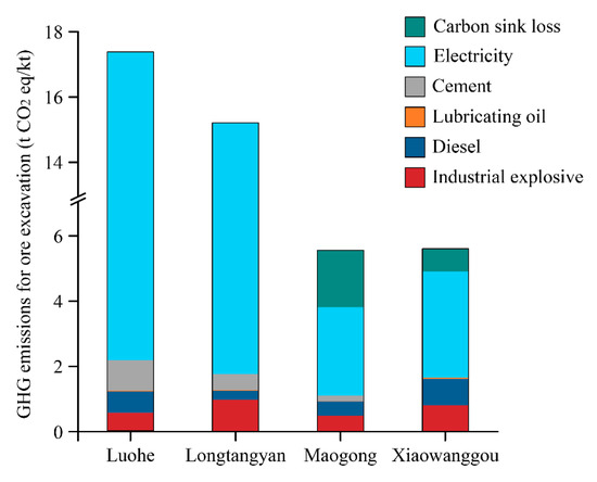 Figure 2 shows that the GHG emissions for excavating a unit quantity of ore in Luohe (17.386 t CO2 eq/kt) and Longtangyan (15.211 t CO2 eq/kt) are much higher than those in Maogong (5.554 t CO2 eq/kt) and Xiaowanggou (5.602 t CO2 eq/kt). This indicates that the mining method, rather than the production capacity, is responsible for the differences in the GHG emissions between projects. The GHG emission distributions in caving-based and filling-based projects, as illustrated in Figure 3, provide additional details regarding these differences. Figure 3 shows that electricity consumption dominates the GHG emissions in both caving-based and filling-based projects, but its share in the filling-based mines (87.422% and 88.374% in the Luohe and Longtangyan iron mines, respectively) is much higher than in caving-based mines (48.703% and 57.881% in the Maogong and Xiaowanggou iron mines, respectively). Notably, the electricity consumption values are 18.890, 16.708, 2.441, and 2.926 MWh/kt in the Luohe, Longtangyan, Maogong, and Xiaowanggou iron mines, respectively, but their associated GHG emissions are 15.199, 13.443, 2.705, and 3.243 t CO2 eq/kt, respectively. The lower GHG emission factor of the electricity in Anhui (Table 3), where the Luohe and Longtangyan iron mines are located, reduces their GHG emissions. Cement is another contributor to the higher GHG emissions in the filling-based cases; the contributions are 0.926, 0.456, 0.167, and 0.003 t CO2 eq/kt in the Luohe, Longtangyan, Maogong, and Xiaowanggou iron mines, respectively. The Luohe and Longtangyan iron mines require 57.877 and 30.387 t of cement to excavate 1000 t of iron ore, whereas those values are 10.415 and 0.166 t/kt in the Maogong and Xiaowanggou iron mines, respectively. The additional cement required in the filling-based cases is primarily used for filling in voids after deposit excavation. This indicates that using low-carbon cementing materials is a robust approach to mitigating GHG emissions in filling-based projects.