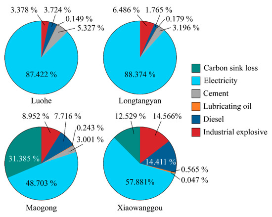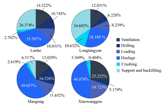 Figure 5 shows that the haulage stage and the support and backfilling stage are the primary contributors to the higher electricity consumption in filling-based projects (i.e., the Luohe and Longtangyan iron mines) relative to caving-based projects (i.e., the Maogong and Xiaowanggou iron mines). The consumption values of electricity in the haulage stage are 5.409, 3.789, 1.343, and 1.494 kWh/t for the Luohe, Longtangyan, Maogong, and Xiaowanggou iron mines, respectively, with shares of the total emissions of 35.587%, 28.188%, 49.657%, and 46.078%, respectively. The higher efficiency that the hauling equipment presents in the caving-based cases accounts for this phenomenon. For instance, the Luohe iron mine has a production capacity similar to that of Maogong, but its larger load-haul-dump machines (LHDs) (type: Sandvik LH514E, bucket volume: 6 m3) present a lower efficiency (400 kt/a) than the smaller LHDs in Maogong (type: CY-4), whose bucket volume and efficiency are 4 m3 and 675 kt/a, respectively. Coincidentally, the efficiency of the LHDs in the Xiaowanggou iron mine (type: Scooptram EST3.5, bucket volume: 2.3 m3, efficiency: 320 kt/a) is also higher than that of the LHDs in Longtangyan (bucket volume: 2 m3, hauling capacity: 200 kt/a). The developed hauling system accounts for this phenomenon, for instance, the preparation ratio in Luohe, Longtangyan, Maogong, and Xiaowanggou iron mines are 2.55, 2.33, 8, and 4.43 m/kt. This indicates that a reduction in GHG emissions in filling-based projects can be expected if the efficiency of the hauling equipment can be improved. Moreover, further developing the efficiency of the hauling equipment can also help to mitigate GHG emissions in caving-based projects, as the hauling stage dominates their electricity consumption (Figure 6). In contrast, the support and backfilling stage constitutes 26.374% and 34.692% of the total electricity consumption in the Luohe and Longtangyan iron mines, respectively (Figure 6). Such values in the Maogong and Xiaowanggou mines are 6.517% and 0.404% (Figure 6), respectively. The additional consumption of electricity in the filling-based projects is primarily utilized to power pumps to either transport or dewater the filling slurry. Such phenomena indicate that approaches for conserving the energy consumed by pumps can also mitigate GHG emissions in filling-based projects.