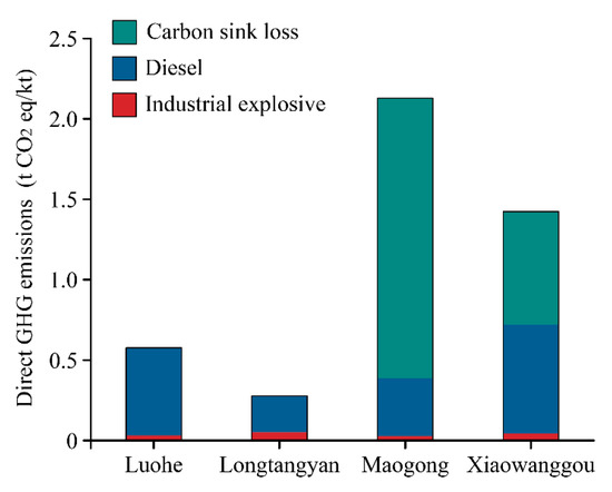 In addition, the carbon sink losses in caving-based projects raises their GHG emissions. These emissions in the Maogong and Xiaowanggou mines are 1.743 and 0.702 t CO2 eq/kt, respectively, whose shares of the total GHG emissions are 31.385% and 12.529%, respectively. This indicates that surface subsidence control and timely reclamation of subsidence pits can mitigate the GHG emissions in caving-based projects. Notably, only the consumption of industrial explosives and diesel and carbon sink losses lead to direct GHG emissions. Thus, it is expected that the GHG emissions in filling-based projects will be lower than those in caving-based projects if only direct GHG emissions are considered in the estimation. The results of such an estimation are shown in Figure 4.