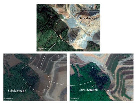Subsidence pit owing to underground caving, observed in the Xiaowanggou iron mine by Google Earth satellite images (41.39 °N, 123.63 °E); (a) Subsidence pit after vertical caving, observed on 1 October 2012.; (b) Extended subsidence pit owing to progressive caving of surrounding rocks, observed on 25 April 2014.; (c) Extended subsidence pit owing to progressive caving of surrounding rocks, observed on 8 May 2017.
