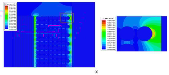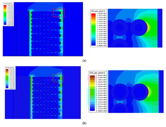 The electric field distributions of MMFT can be obtained using the established finite element model. The core structure is shell type, and the windings are arranged as shown in Figure 3a. Two connection modes are simulated, including series connection mode and independent operation mode. In series connection mode, the excitation voltages of multiple output windings increase from bottom to top, while in independent operation mode, the excitation voltage of each output winding is consistent. The electric field distributions for the two connection modes are simulated as shown in Figure 4a,b. The maximum electric field intensities Emax for the two connection modes are shown in Table 3, as can be seen, Emax of series connection mode is higher, which is 4.8 times that of the independent operation mode. In series connection mode, the excitation voltage of multiple output windings is cumulative, resulting in a high voltage and a high electric field intensity in the first output winding.