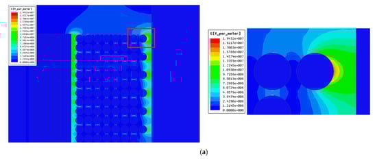 Figure 9a–c provides the electric field distributions for the three hollow windings, and high electric field intensity arises mainly in two regions, the region between primary and secondary winding, and the region between secondary winding and core. Table 7 shows the maximum electric field intensities Emax of the three hollow windings, and as can be seen, Emax basically remains unchanged with the decrease of the hollow ratio Δh, and Emax of hollow winding is slightly higher than that of solid conductor winding. First, the change of area of the hollow part does not affect the potential of the conductor, so the electric field intensity is basically unchanged at different hollow radiuses as shown in Table 7. Second, the potential of the conductor remains the same whether it is a solid conductor or a hollow conductor when the excitation voltage is consistent, thus, the electric field intensities of solid conductor winding and hollow winding are basically the same, and the hollow part causes the variation of the model’s subdivision mesh, which may lead to slight differences of the calculation results; therefore, Emax of solid conductor winding and hollow winding are not exactly the same as shown in Table 7.