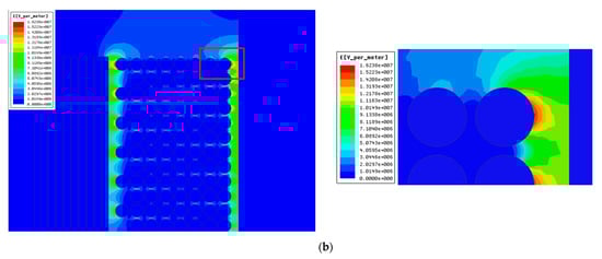 - For the value of the maximum electric field intensity, close result can be found in previous work, for example, 14 kV/mm in [], while the range in this paper is 6~20 kV/mm, which proves that the results in this paper are at a reasonable level.