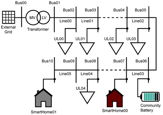 General schematic of a three-phase unbalanced distribution grid with a medium-voltage/low-voltage transformer, uncontrollable loads (UL), smart buildings and a community battery system.