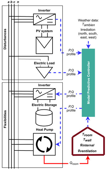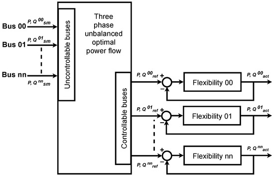 The smart buildings that are described in Section 5.1 are controlled hierarchically [32]. Inputs to the stratified controller are the smart meter active and reactive power forecasts (). The forecasting method is based on convolutional neural networks, and details about it are not presented in this paper. Three-phase unbalanced optimal power flow from Section 4.1.1 generates optimal active and reactive power set-points to controllable buses. The locations of these buses are chosen based on Section 4.1.2 and Equation (13). Since DERs are intermittent in nature, follow daily, weekly and seasonal cycles, these changes are reflected in the optimal set-points. The flexibility controller must be robust enough to accommodate these changes. The authors have chosen a model predictive control to schedule them optimally. MiQ-MPC receives set-points and is used as reference input signals.