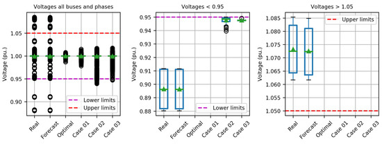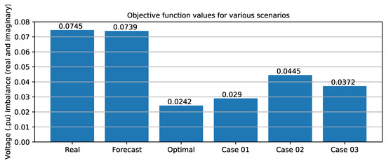 Figure 9 presents the function values for all the scenarios based on the objective in Equation (2). As discussed earlier, it can be observed that the unbalance is minimized for each case when compared to the benchmarks. There is an 85.92%, 64.27%, and 77.02% reduction in three-phase unbalance for Cases 01, 02, and 03, respectively (the imbalances are in Voltage (p.u.) values). Stratified controllers are written in Python, including three-phase unbalanced optimal power flow and model predictive control.
