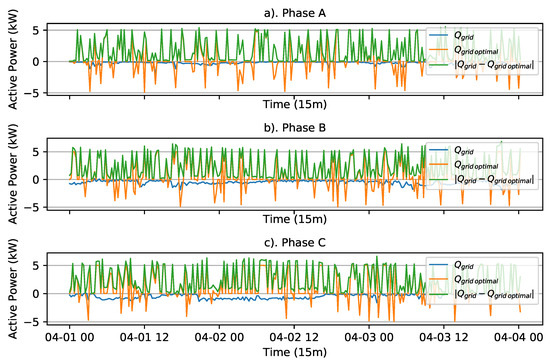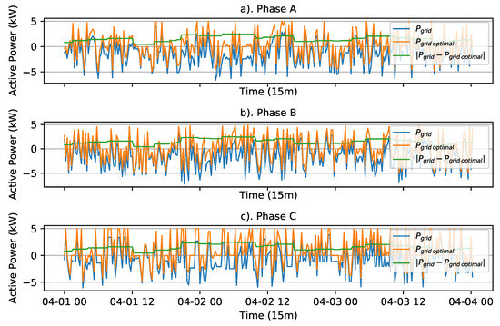 Per phase active powers at point of common coupling, grid optimal schedule and absolute difference between them at Bus 020.