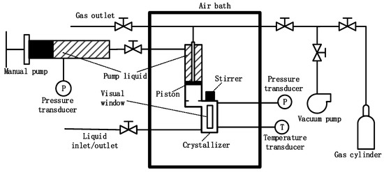 The experimental apparatus used in Section 2.2 and Section 2.4 is shown in Figure 1. The maximum volume of the variable cell is 665.0 mL. The uncertainty of the measured temperature inside the crystallizer is ±0.05 K. The uncertainty of the measured pressure inside the crystallizer is ±0.005 MPa.