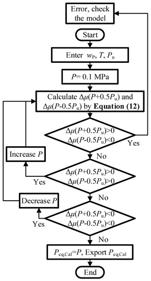 When ∆μ is positive under P − 0.5Pu and negative under P + 0.5Pu, which means that P − 0.5Pu is lower than Peq,Cal and P + 0.5Pu is higher than Peq,Cal, the difference between P and Peq,Cal is smaller than Pu, which means that P can be regarded as Peq,Cal and the accuracy meets the requirement of the model calculation. When ∆μ is positive under P − 0.5Pu as well as P + 0.5Pu, P is lower than Peq,Cal and the difference between P and Peq,Cal can be larger than Pu. When ∆μ is negative under P − 0.5Pu as well as P + 0.5Pu, P is higher than Peq,Cal and the difference between P and Peq,Cal can be larger than Pu. It should be pointed out that if ∆μ is negative under P − 0.5Pu but positive under P + 0.5Pu (which never happened in this work), which means that Peq,Cal is smaller than P − 0.5Pu but is higher than P + 0.5Pu, which is contrary to reality, then the calculation would end and the model would be rechecked.