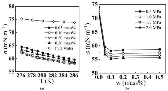 As is shown in Figure 3, the interfacial tension is effectively decreased by using SLS. The gas–liquid interfacial tensions of water system are all higher 73 mN∙m−1, whereas those of the SLS solution systems are all lower than 65 mN∙m−1.
