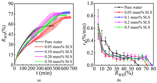 In Figure 4a,b, the rR in the hydrate formation using SLS solution does not decreases with the increase in wp,0, which indicates that the negative effect of SLS on rR does not increases with the increase of wp,0 in the experimental range. The rR in the hydrate formation using the 0.2 mass% SLS solution is slightly faster than those of the hydrate formations using the other SLS solutions, whereas the formation rates of the hydrate formation using the 0.1 mass% SLS solution and 0.5 mass% SLS solution show little difference. That indicates that, in a specific SLS concentration range, increasing wp,0 can increase the positive effect of SLS on the rR, and this trend is also found in the hydrate formations of the CH4+ lithium dodecyl sulfate solution system [59] and CH4+ dodecylbenzene sulfonic acid solution system [59].