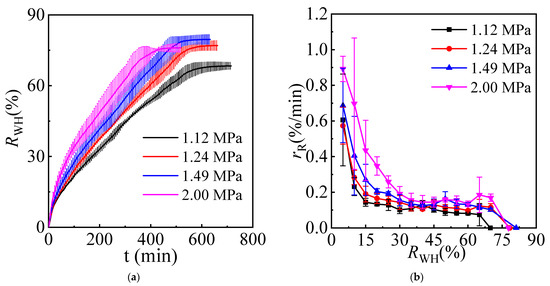 The rR in the hydrate formation under 1.12 MPa significantly decreases with the increase in RWH when RWH is higher than 65%, whereas the rR in the hydrate formations under the other pressures significantly decrease with the increase in RWH when RWH is higher than 70%. The above indicates that when the pressure is higher than a specific value, rR can no longer be kept by increasing the pressure.