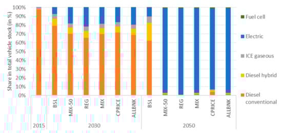 Shares in the bus vehicle stock by type of drivetrain in 2030 and 2050 [49]. BSL—(Baseline scenario) achieving the existing 2030 GHG emissions, renewables and energy efficiency of EU targets. The baseline scenario covers the transport policies adopted up to the end of 2019. MIX-50—An increased ambition scenario to achieve at least 50% GHG reductions. REG—A regulatory-based measures scenario that achieves around 55% of GHG reductions. MIX—Following a combined approach of REG and CPRICE, which achieves around 55% GHG reductions, both by expanding carbon pricing and with ambitious policies that are somewhat lower than those of REG. CPRICE—A carbon-pricing based scenario that achieves around 55% GHG reductions. It assumes the strengthening and further expansion of carbon pricing, via the EU ETS or other instruments, to the transport and buildings sectors, combined with low-intensity transport policies without intensifying energy efficiency and renewables policies. ALLBNK—The most ambitious scenario in GHG emissions reduction, based on MIX and further intensifying fuel mandates for aviation and maritime sectors in a response to an extended scope of GHG reductions covering all aviation and shipping.