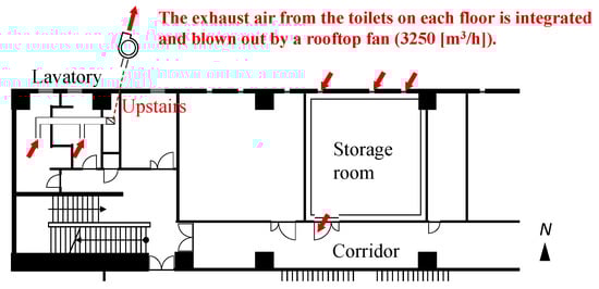 The temperature and humidity in each space were assumed to be affected by the heat and moisture exchange with the material surface and the heat and moisture transport associated with the airflow between the spaces. The amount of airflow between each space was calculated using a multiroom airflow network model. The model accounted for the negative pressure in the south corridor of the storage room caused by the lavatory exhaust fan. The developed numerical model also considered the heat exchange with the air duct that passed through the attic space.