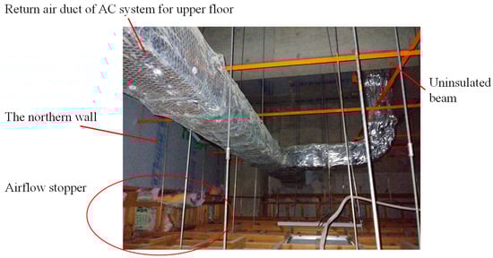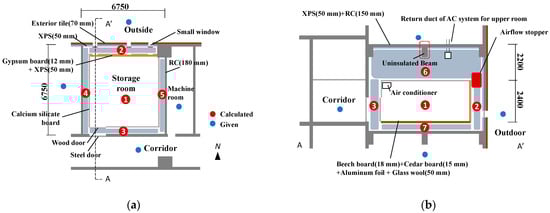 The target storage room was located on the middle floor of the building, with the northern side facing the outdoor air and the southern side facing the indoor corridor, as shown in Figure 4a,b. The floor area and room volume were approximately 37.8 m2 and 90.6 m3, respectively. The thickness of the side buffer space was around 0.2 m; the height of the attic space and the crawl space were 2.4 m and 0.12 m, respectively. The buffer spaces, attic space, and crawl space were connected, allowing air to move between them. The west room and the lower-floor room were non-air-conditioned storage rooms, and the east room was a machine room. The upper-floor room was a storage room that was constantly air-conditioned, as mentioned earlier.
