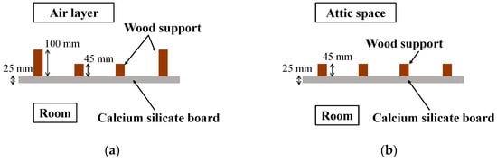The thickness of the wooden support for the inner walls and ceilings was 100 mm or 45 mm, respectively (Figure 5). The area of each part is shown in Table 2. The materials and thicknesses of the other components are shown in Figure 4a,b.